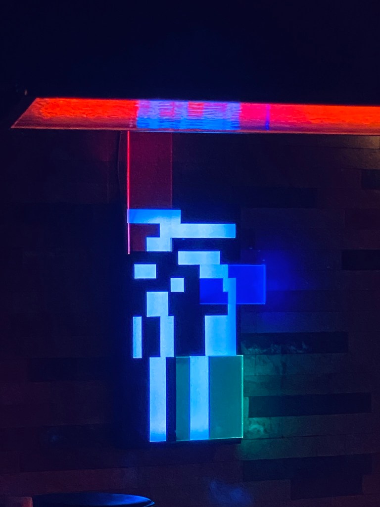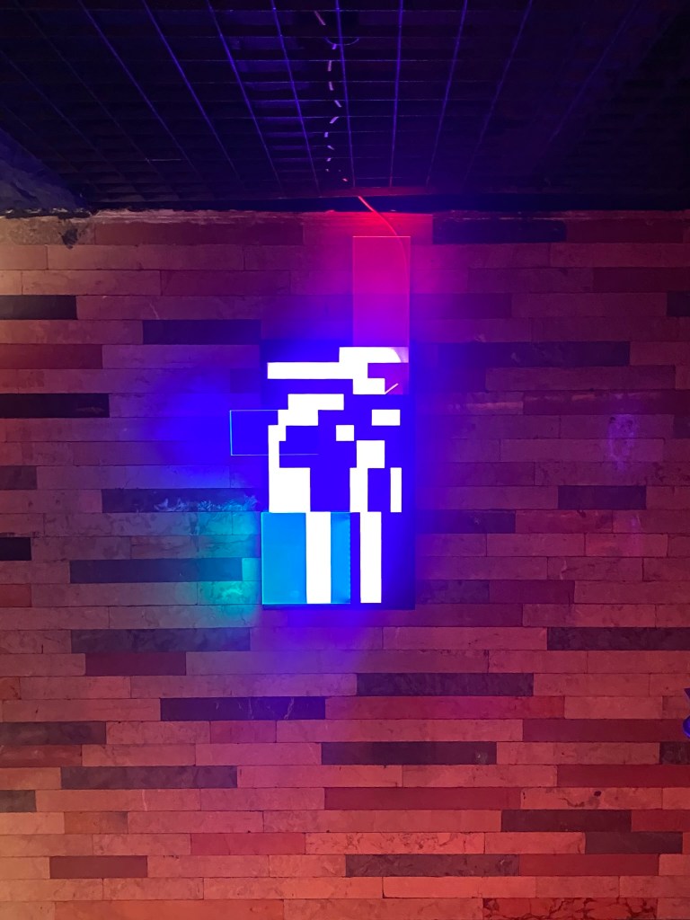 Pixel Glitch presents a moment of digital rupture translated into physical space. A fragmented form emerges unexpectedly, distorted in geometry and animated by seemingly random color variations. Set against a rhythmic, tiled background, the work disrupts visual order and introduces a sense of instability and motion within the dark, immersive atmosphere of a nightclub.